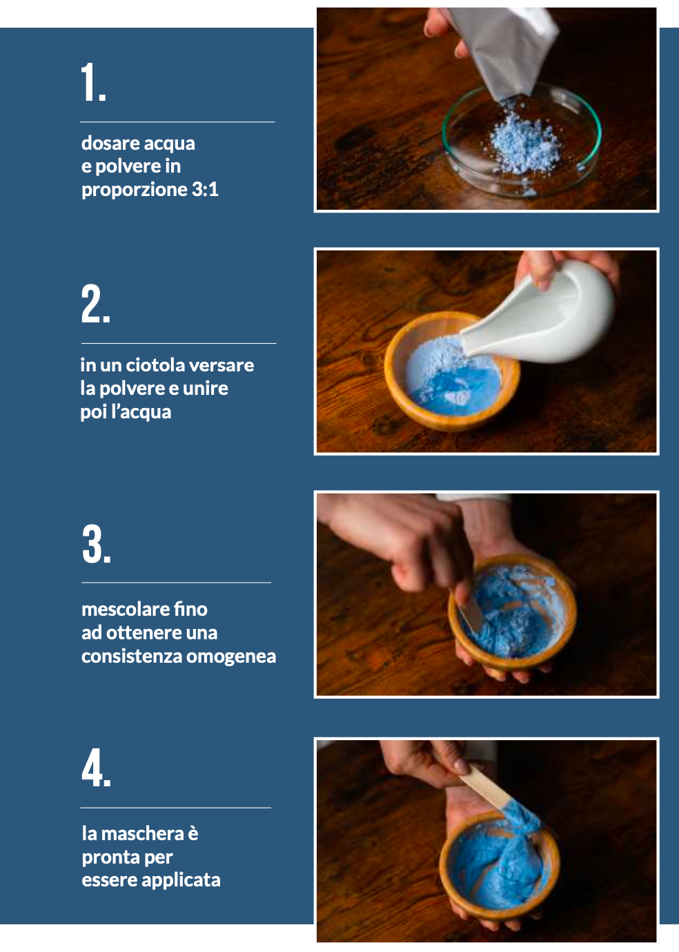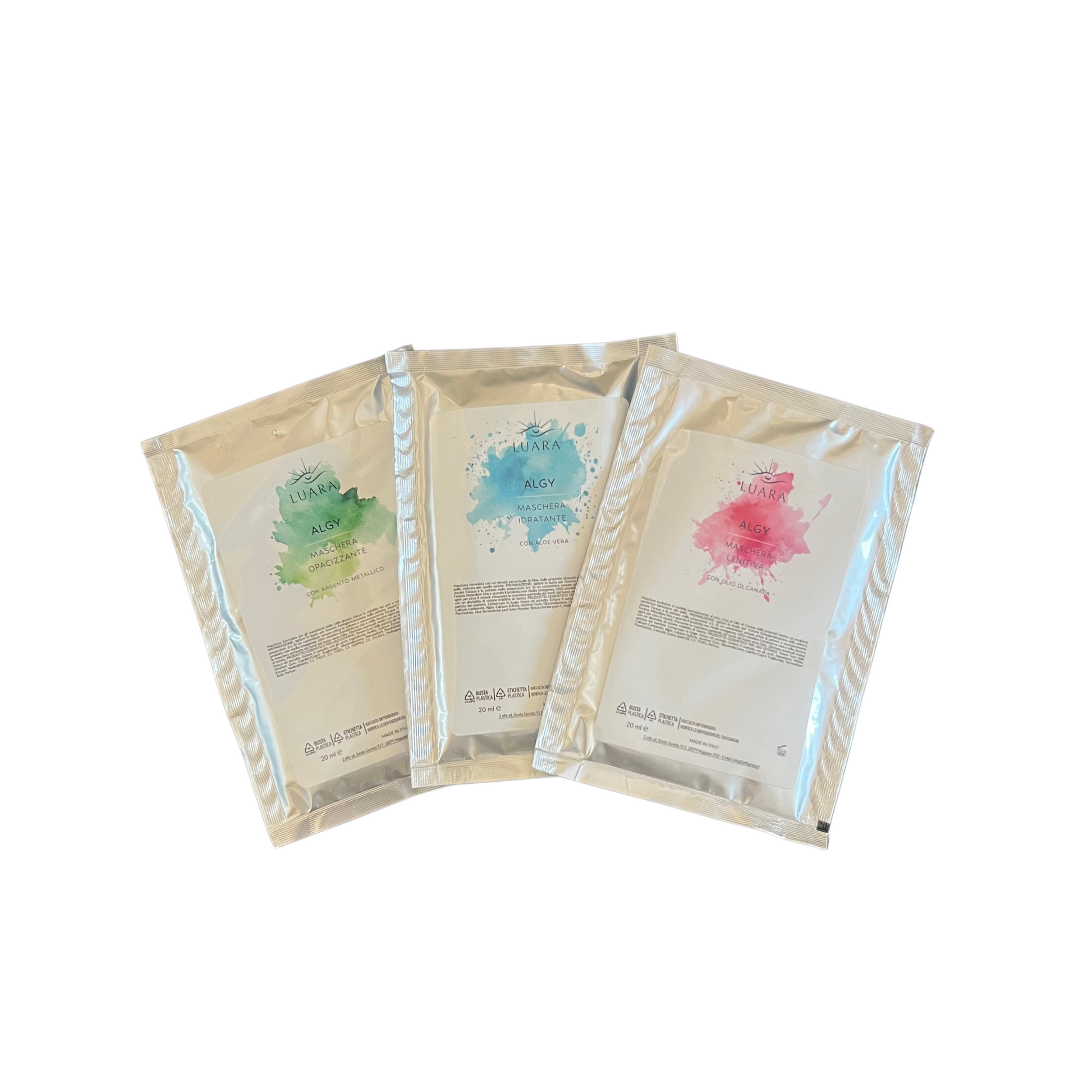 Algy è una maschera in alginato, trattamenti professionali a base di alginati, sostanze naturali estratte dalle alghe brune. Queste maschere hanno una texture inizialmente polverosa e, una volta miscelate con acqua, si trasformano in un composto cremoso che si applica sul viso. Dopo alcuni minuti si solidificano creando un effetto “gommoso” e fresco, che aderisce perfettamente ai contorni del viso.
